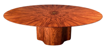 78" x 48.25" x 28.75". Radial Walnut, deep rich color, with a 3" brass locus within the center. $12,400