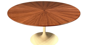 59.5" round diameter dining table. Affixed to an original 1950's, early 1960's full size cast iron Knoll base which is very heavy and sturdy. Base has been reconditioned. The top is a radial sunburst with rounded edges and finished in a satin coat. Seats 6-8 with ease. Price $9,500