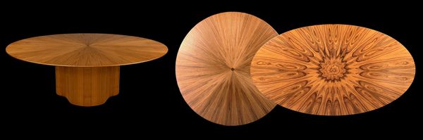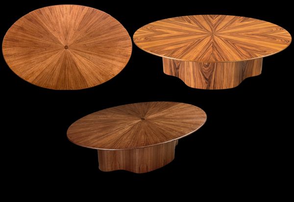 Round, Oval or Rectangular. Almost any dimension and species possible with santos rosewood and walnut shown to the right. Various base styles available. Price range 7,500 and above. See our gallery for images and videos. Typically 54" x 36" oval 15.75" tall, ovals up to 72" and rounds 42-48". See footer for catalog & pricing